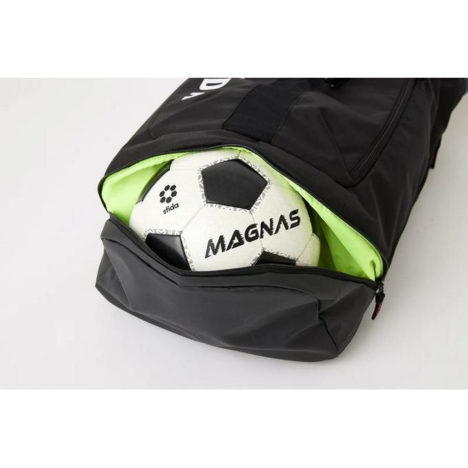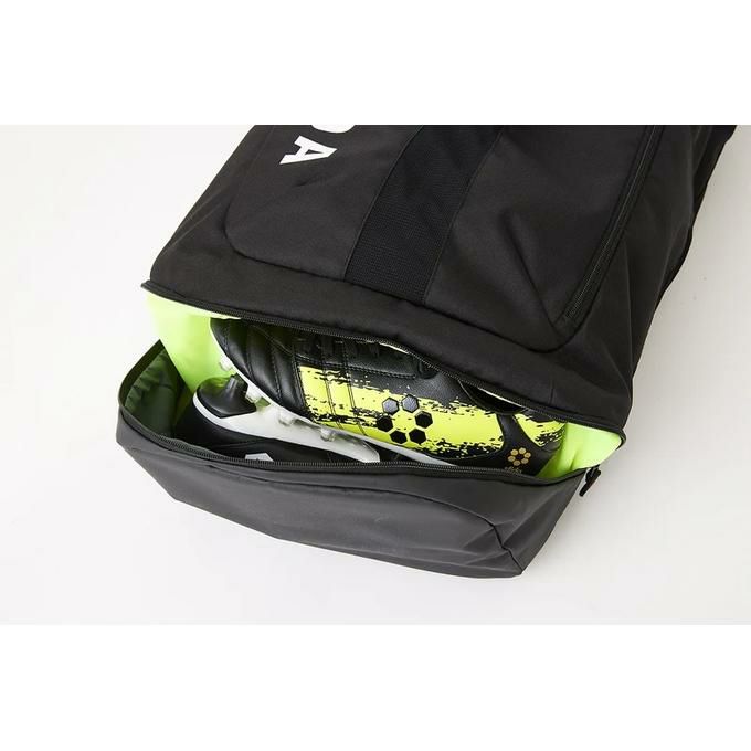 ・サイドアクセスファスナー付き。シューズ2足もしくは底面収納にはボールも入れる事が可能。前面のDリングには追加のバッグ等を掛ける事を可能に。