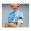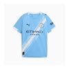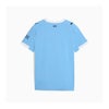 程よいフィット感で快適な着心地のレギュラーフィット半袖湾曲サイドパネルと腋下パネルクルーネック右胸にプーマキャットのロゴ左胸にマンチェスター・シティバッジ8才以上のお子様にお勧めのサイズ