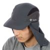 テフロン撥水加工を施した本体に、防虫・UVカット機能を持つスコーロン素材のサンシェードを備えたフィールドキャップ。夏場に不快な虫や日焼けから首周り・顔側面をガードします。スベリ背面側の頭囲サイズ調整アジャスターにより、マイナス2cmまでをカバー。