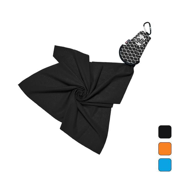 水に濡らして絞って振るだけで接触体感温度が約3℃下がる冷感タオルを、携行に便利なカラビナ付きのポーチに収納。とても軽くて吸水性にも優れています。