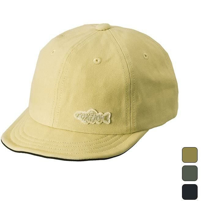 Foxfireの文字で魚を模ったワンポイントワッペンが付いた洗いざらしのキャンバスキャップ。畳んでポケットやバッグに収納できるクラッシャブル構造で、ツバの形状を自在に変えられるワイヤー入り。背面はベルトアジャスター仕様です。