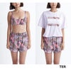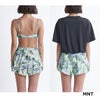 ラッシュT、トップ、ボトム3点セットの水着。トップスはややスクエアネック気味のシルエットがポイント。また、キュロット型のボトムはヒップラインをカバーしてくれます。ラッシュTはドロップショルダーで女性らしいシルエットを演出します。スイムウエアには今シーズンのリーフを中心としたボタニカル柄を使用しました。