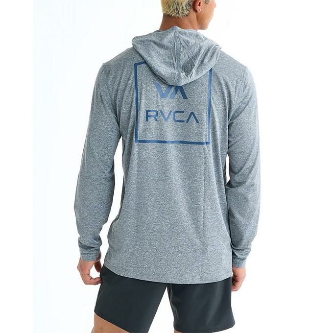 フード付きの長袖のサーフトップ。UVA・UVBカット機能を搭載。胸元にVAとRVCAのボックス型のグラフィックを、右袖先にRVCAロゴをあしらいました。サーフィン中の日焼け対策としてはもちろん、デイリーウエアとしてもおすすめです。