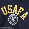 胸のプリントはアメリカ合衆国の空軍士官学校(United States Air Force Academy)をモチーフにしたもので、アーチ型にレイアウトした「USAFA」の文字の下に校章をイメージしたデザインで、シルバーグレーのボディには染み込みプリント、ダークネイビーにはラバープリントを使用しています。