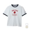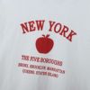 環境に配慮して生産されたサステナブルなアメリカ綿を使用したショートスリーブリンガーTシャツです。リンガーTシャツは襟ぐりや袖口にパイピングを入れて強度を増した、ヨレにくい作りが特長。「スラブ糸」と呼ばれる表面にムラのある糸を使用した素材のため、程良い凹凸感があり、肌にまとわりつきにくいのもポイントです。さらに汗や湿気などの水分に対する吸熱反応により涼感をもたらす「キシリトール加工」を行った、盛夏に最適なアイテムです。胸のアーチ状に組んだ「NEW YORK(ニューヨーク)」に添えられたリンゴはNEW YORKの愛称「The Big Apple(ビッグアップル)」にちなんだもので、その下にニューヨーク市の5つの行政区名をプリントしています。
