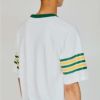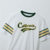 環境に配慮して生産されたサステナブルなアメリカ綿を使用したショートスリーブTシャツです。「スラブ糸」と呼ばれる表面にムラのある糸を使用した素材のため、程良い凹凸感があり、肌にまとわりつきにくいのが特長。さらに汗や湿気などの水分に対する吸熱反応により涼感をもたらす「キシリトール加工」を行った、盛夏に最適なアイテムです。胸のグラフィックは、チームスポーツのユニフォームに見られる文字とリボンを組み合わせたデザインを踏まえたもので、筆記体風の書体で「California(カリフォルニア)」とプリント。リボン状の部分に「Los Angeles(ロサンゼルス)」と入れています。両袖にはサンドイッチラインのプリント入りです。