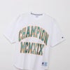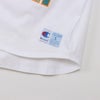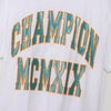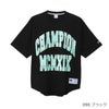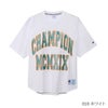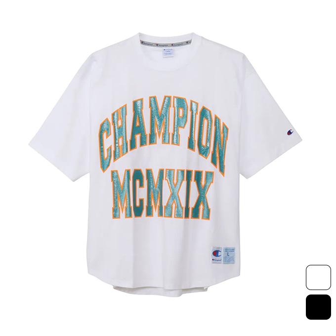 身幅、肩幅、袖幅に大きくゆとりを持たせたACTION STYLE(アクションスタイル)独自のサイジングのルーズフィット、裾は前後の丈に差を付けたラウンドカット仕様です。製品洗い加工により、着用の当初から着慣れた風合いが味わえます。胸にはアーチ型に組んだ「CHAMPION(チャンピオン)」とブランドの創設年である1919年のローマ数字表記「MCMXIX」を組み合わせた大型のグラフィック入り。ラメ入りのグリッタープリントによる文字を、別色のラバープリントで縁取っています。襟内側にChampionロゴ入りのテープを貼って襟ぐりの補強を行うと同時に、デザインにアクセントを添えています。裾にはジョックタグ付きです。