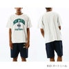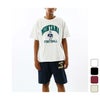 本来は縦方向に使われる生地を横方向に使用する「REVERSE WEAVE(R)」製法によって縦の生地の縮みを防ぐと同時に、両脇に「EXPANSION GUSSET(エクスパンションガゼット)」を付けることで横の縮みへの影響を少なくし、動きやすさに配慮しています。身幅にゆとりを持たせたリラックスフィット。胸のプリントはチャンピオンと親和性の高いカレッジ風グラフィックを現代に落とし込んだもので、アーチ状の文字組と校章を組み合わせたデザイン、アーチ状とストレートの文字組にマスコットを組み合わせたデザイン、アーチ状とストレートの文字組を組み合わせたデザインの3タイプ(6種類)。魅力的なアートワークを2色使いの染み込みプリントやラバープリントで表現しています。製品洗い加工により、着用の当初から着慣れた風合いが味わえます。