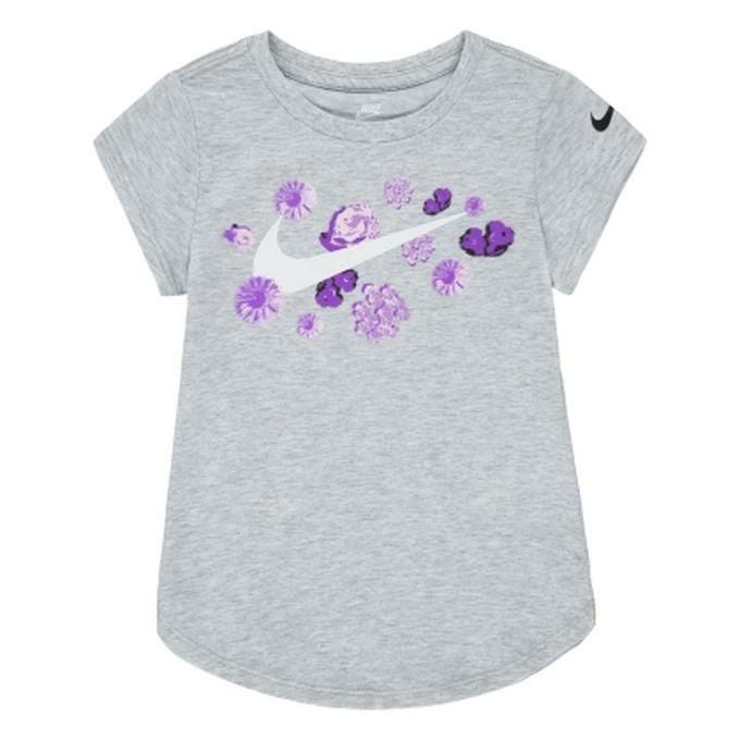 胸にロゴがプリントされ花がプリントされた、Nike Tシャツ。左袖にはロゴプリント。