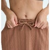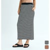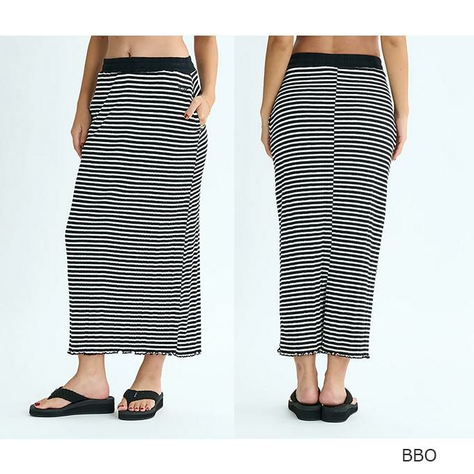 ランダムリブ素材のロングスカート。ストンと落ちたストレートのシルエットで、裾はフリルのように揺れ感のあるメロー始末。バックスリットを入れたので、足捌きよく着こなせます。ウエストにはROXYマークの刺繍とスリットポケットを付けました。ウエストはゴム仕様です。BBOのみ、ボーダーのデザインです。ミニマムサイズのTシャツやタンクトップと合わせて、すっきりしたIラインコーデを楽しめるアイテムです。