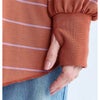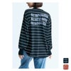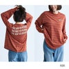 レーヨン混の薄くてソフトな着心地の良いロングスリーブトップス。ルーズなシルエットで、長いリブにふんわりとボリュームのある袖がかわいいデザインです。背中には波のように流れるメッセージプリントをあしらいました。ラウンドした裾はウエストインしてもかわいいです。
