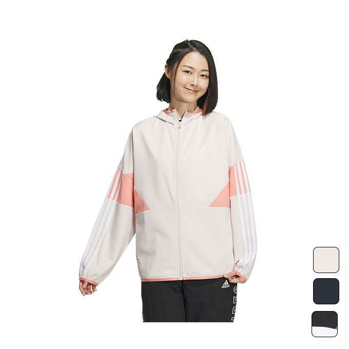 AEROREADY素材が風雨から身体を保護する、このルーズフィットのフード付きアディダスジャケットは、近所へのちょっとした買い物から、友達との夜の外出まで、様々なシーンで活躍。わずかに独特な素材感のあるドビー素材を使用。ゆったりとしたシルエットだから、中に重ね着しても快適な着心地が続く。ジップを上まできちんと閉めてフードを被ったり、ジップを開けたままトップスの上にさっと羽織ったり、自由なスタイリングが可能。