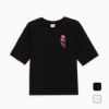 フロントとバックに鮮やかな花のグラフィックをあしらった半袖Tシャツ。