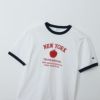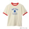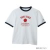 環境に配慮して生産されたサステナブルなアメリカ綿を使用したショートスリーブリンガーTシャツです。リンガーTシャツは襟ぐりや袖口にパイピングを入れて強度を増した、ヨレにくい作りが特長。「スラブ糸」と呼ばれる表面にムラのある糸を使用した素材のため、程良い凹凸感があり、肌にまとわりつきにくいのもポイントです。さらに汗や湿気などの水分に対する吸熱反応により涼感をもたらす「キシリトール加工」を行った、盛夏に最適なアイテムです。胸のアーチ状に組んだ「NEW YORK(ニューヨーク)」に添えられたリンゴはNEW YORKの愛称「The Big Apple(ビッグアップル)」にちなんだもので、その下にニューヨーク市の5つの行政区名をプリントしています。