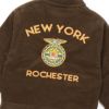 右胸に入れた筆記体の「Champion Authentic American Athleticwear(チャンピオン オーセンティック アメリカン アスレチックウェア)」は細目のチェーン刺繍で、背中の「NEW YORK ROCHESTER(ニューヨーク ロチェスター)」は太目のチェーン刺繍。さらに背中の刺繍の下に、FFAのシンボルマークをイメージしたオリジナルデザインのワッペンを付けています。身幅にゆとりを持たせたサイズ感で、収納に便利なサイドポケット付き。