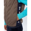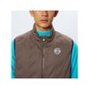 「空気をミカタにする」中空構造の軽量&保温中わた+ストレッチジャージーを、伸縮性を妨げにくい圧着始末で仕上げたエアジャスター中わたベストです。断熱性と軽さを実現する中わたと、伸縮性が高く柔らかなストレッチジャージーのコラボレーション。キルト(縫製)ではなく、圧着始末で表地&板形状中わたを留めることによって全体のストレッチ性を確保する上、中わた繊維の表側への吹き出しも起きにくくさせるというオムニテクニカル・ファンクションです。圧着部分にブランドロゴ型押しを施し、一味違う見栄えで仕上がった中わたファブリックが先進的。個性的でありながらも、さまざまなアイテムとのコーディネートがしやすい汎用性の高いデザインで仕上がっています。