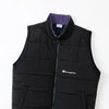 光沢感とストレッチ性が特長のオリジナルタフタ素材を使用した、中綿入りのジップベストです。軽量で、保温性に優れ、防風機能も備えています。表地に撥水加工を行っているので、ちょっとした雨天の際にも着用できます。襟裏にボディカラーと異なる色を使ったフリースを付けることで保温性をさらに向上。身体にフィットするリブ仕様の裾は、ドローコードを絞ることで風の侵入を防ぎます。使いやすいダブルジップ仕様は、下のジップを開閉することで通気性の調節やかがんだ時のたわみの軽減などが可能。両サイドにポケット付き。胸にChampion(R)(チャンピオン)ロゴをラバープリントで入れたシンプルなデザインです。