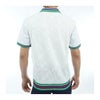 軽量感のあるポリエステル糸を使用したクルーネックセーターベスト。編み地変化の凹凸感でTHのモノグラムを表現。裾のマルチストライプがポイントです。