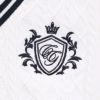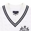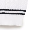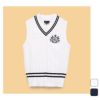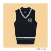 ソフトなタッチのポリエステル糸を使用。細い縄編みとダイヤ柄を入れたトラディショナルなベストです。首元の幅広リブ、裾と襟の太めの配色ラインでスポーティーさをプラスしました。胸元にはエンブレムCGを刺繍し、クラス感を演出しています。