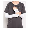 接触冷感機能糸を使用したベア天竺素材を採用したアームカバー。手の甲までしっかり日よけができるようなデザインです。手首部分がゴムシャーリング仕様になっており、手甲カバー部分が邪魔な時はたくし上げることができます。