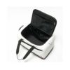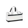 レザー調PU生地とエナメル生地を使用した、高級感のあるモデルです。ゴルフロッカーに立てた状態でも収納しやすいよう、側面ハンドルをつけました。本体外側に、ファスナーポケットが2か所あります。開口部がコの字型になっており、出し入れしやすい仕様です。開口部裏側は視認性の良いメッシュ仕立てのファスナーポケットで、本体内部には、ファスナーポケット、二つの仕切りポケット付き。取り外し可能なパット付きショルダーベルトも付属しています。