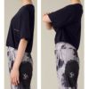 ゆったりとした幅広のハーフスリーブは少し長めの丈で、気になる二の腕をカバー。
