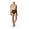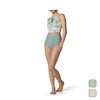 ポリエステル100%ながら優れた伸縮性を実現、塩素による劣化に強い素材を使用したスイムウェア。高いホールド感とフィット感で動きやすく、フロントジップタイプで着脱もしやすい。同素材のショートボトムと合わせてフィットネス用にもおすすめ。