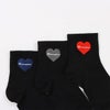 3足組クォーターレングス丈ノンパイル仕様のソックスです。外側にはChampion(R)(チャンピオン)ロゴを入れたアイキャッチな大きなハート刺繍、内側にはワンポイントのCロゴを編み、コーディネートに合わせて履き方を変えられる2wayデザイン仕様です。異なる刺繍色・Cロゴカラーの同色アソート。