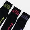 3足組クォーターレングス丈ノンパイル仕様のソックスです。履き口部分のリブによる、程良いフィット感が特長。どんなスタイリングにもアクセントになる、「IT TAKES A LITTLE MORE TO MAKE A CHAMPION」を足首後ろ側に編んでいます。ブラックの3足組とビビッドカラーの3色アソートの2タイプ。
